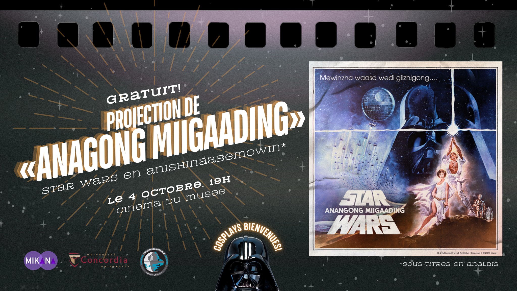 Star Wars revient sur grand écran — en Anishinaabemowin (ojibwé) ! Mikana et l'Université Concordia organisent une projection communautaire unique de Star Wars — entièrement doublé en Anishinaabemowin (ojibwé) — le samedi 4 octobre à 19h au Cinéma du Musée à Tiohtià:ke (Montréal). Cet événement gratuit réunit de manière significative la culture pop et la revitalisation linguistique.